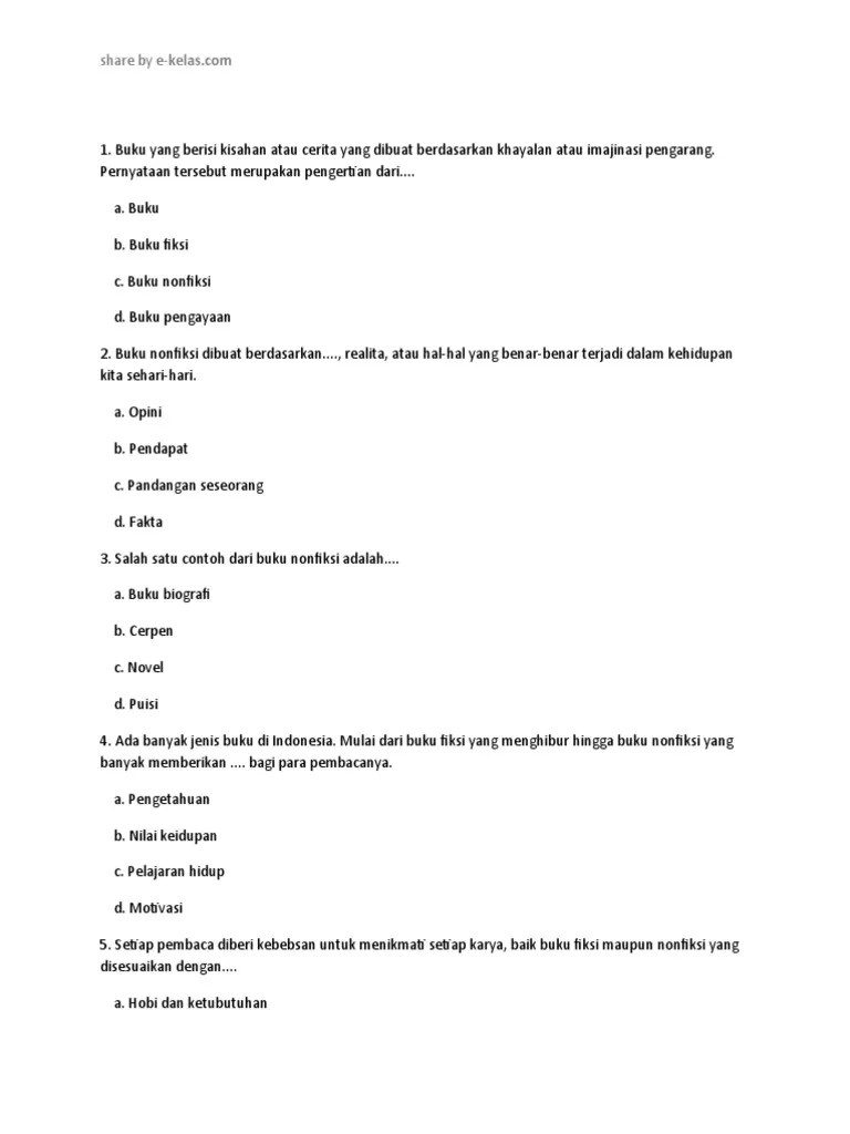 5.cerita fiksi atau rekaan sengaja dikarang oleh pengarang baik yang pernah terjadi secara nyata maupun dalam khayalan pengarang ,cerita fiksi . Buku fiksi adalah buku yang berisi cerita atau kejadian yang tidak. Soal buku fiksi dan nonfiksi lengkap jawaban thursday, october 4, 2018 bahasa indonesia edit latihan soal pilihan ganda materi buku fiksi dan . Contoh soal materi teks buku fiksi dan nonfiksi dalam mata pelajaran bahasa indonesia kelas vii dan ix revisi. Berikut ini kakak akan memberikan contoh soal pg bahasa indonesia kelas 7vii semester 2 beserta jawabannya kurikulum 2013 k13.